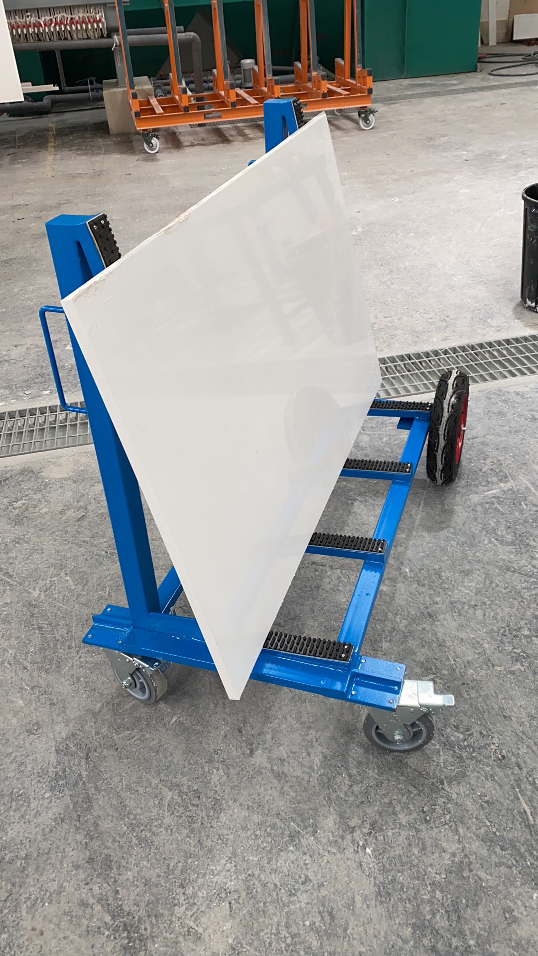 此設(shè)計(jì)用于廠區(qū)內(nèi)外的板材運(yùn)輸和儲(chǔ)存,支架表面覆蓋一層橡膠層,保護(hù)板材免于刮傷。