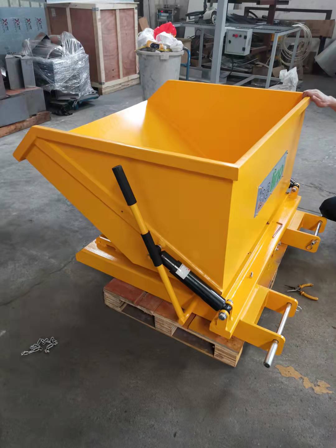 The release mechanism is activated by the forklift operator pulling the draw rope the driver's seat. The custom-built shock absorber prevents impact forces being transmitted to the forklift during emptying.